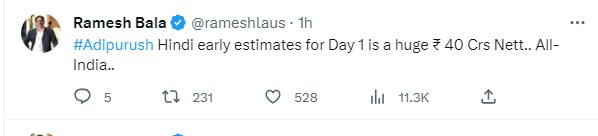भगवान राम और माता सीता की अद्भुत कहानी और भगवान हनुमान के श्रीराम के प्रति समर्पण की कहानी को दिखाती 'आदिपुरुष' (Adipurush) ने पहले दिन उम्मीद से अच्छा कलेक्शन किया है। शुरुआती अनुमान के अनुसार, फिल्म ने फर्स्ट डे 90 करोड़ का कारोबार किया है। फिल्म क्रिटिक रमेश बाला के अनुसार, हिंदी में फिल्म ने 40 करोड़ का नेट कलेक्शन किया है।
