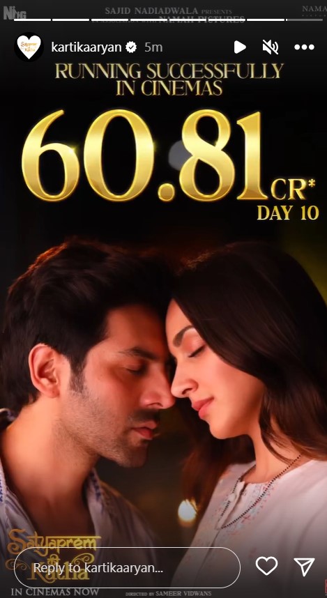 कार्तिक आर्यन और कियारा आडवाणी की लव स्टोरी वाली फिल्म 'सत्यप्रेम की कथा' दर्शकों का दिल जीतने में कामयाब रही है। मूवी पहले दिन से ही रॉक सॉलिड कलेक्शन कर रही है। धीमी रफ्तार से ही सही, लेकिन फिल्म धीरे-धीरे आगे बढ़ रही है।'सत्यप्रेम की कथा' ने 9 करोड़ 25 लाख से घरेलू बॉक्स ऑफिस पर ओपनिंग ली। फिल्म का बजट 50 करोड़ बताया जा रहा है। इस लिहाज से मूवी ने 10 दिनों के अंदर अपनी लागत निकाल ली है। मूवी ने 10वें दिन चार करोड़ के आसपास का बिजनेस किया है, जिससे फिल्म का कुल कलेक्शन 60.81 करोड़ के आसपास का हो गया है।