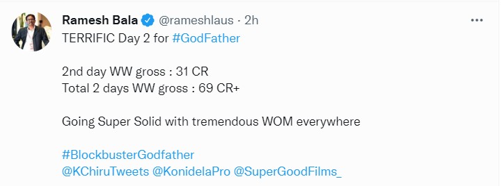 90 करोड़ के बजट से बनी गॉडफादर ने दो दिन के टोटल कलेक्शन के अनुसार, 50 करोड़ का बिजनेस पार कर लिया है। ट्रे़ड एनालिस्ट रमेश बाला ने बताया कि #Godfather ने दूसरे दिन वर्ल्डवाइड ग्रॉस 31 करोड़ का बिजनेस कर लिया है। गॉडफादर की दो दिन की टोटल कमाई 69 करोड़ के पार हो गई है। यह फिल्म सभी स्क्रिन्स पर पॉजिटिव रिस्पांस दे रही है।