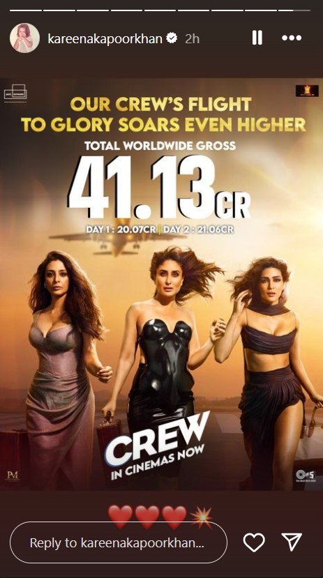 'क्रू' एकता कपूर, रिहा कपूर और अनिल कपूर के प्रोडक्शन में बनी मूवी है। फिल्म ने 20 करोड़ से ग्लोबल बॉक्स ऑफिस पर खाता खोला था। वहीं, दूसरे दिन इस मूवी ने इससे भी थोड़ी सी ज्यादा कमाई करते हुए इतिहास रच दिया है। करीना कपूर ने फिल्म के ऑफिशियल आंकड़े शेयर किए हैं। दो दिनों में 'क्रू' ने 41.13 करोड़ का कलेक्शन कर डाला है। यानी तीसरे दिन तक फिल्म आराम से 50 करोड़ का आंकड़ा पार कर ले जाएगी।