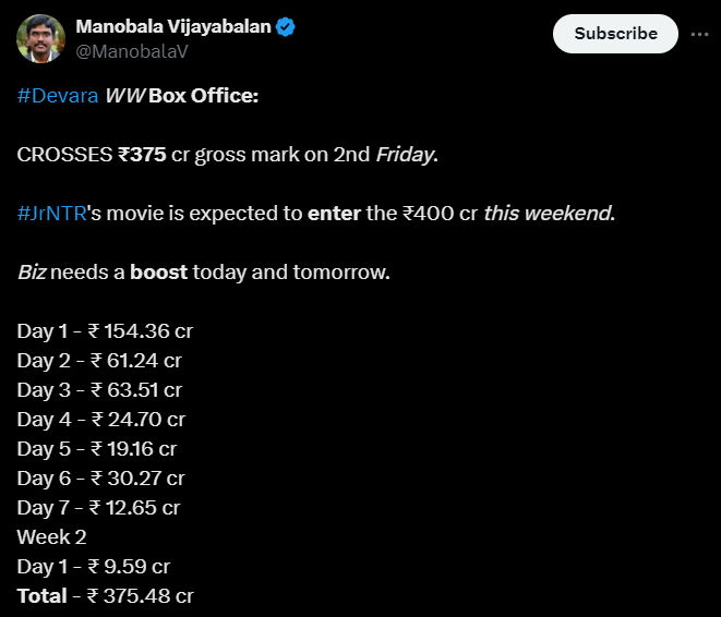 अब हाल ही में साउथ के ट्रेड एनालिस्ट मनोबाला विजयबालन ने फिल्म के दूसरे हफ्ते के पहले दिन यानी कि फ्राइडे के वर्ल्डवाइड आंकड़े भी अपने आधिकारिक एक्स अकाउंट पर शेयर कर दिए हैं। मूवी ने शुक्रवार को टोटल 9.59 करोड़ का सिंगल डे पर कलेक्शन किया है।