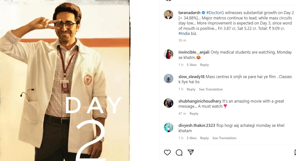 कैंपस कॉमेडी ड्रामा फिल्म डॉक्टर जी ने 14 अक्टूबर को रिलीज के साथ ही ठीक-ठाक ओपनिंग की। फिल्म के पहले दिन का बॉक्स ऑफिस कलेक्शन लगभग 3.87 करोड़ का रहा। अब डॉक्टर जी के दूसरे दिन यानी शनिवार का कलेक्शन भी सामने आ गया है। फिल्म ने बॉक्स ऑफिस पर तेजी से रफ्तार पकड़ते हुए कमाई में लगभग 35 प्रतिशत की बढ़ोत्तरी दिखाई है। ट्रेड एनालिस्ट तरन आदर्श के अनुसार डॉक्टर जी ने शनिवार को 5.22 करोड़ का कलेक्शन किया है और इसके साथ ही दो दिनों के भीतर ही फिल्म की कुल कमाई 9.09 करोड़ पहुंच गई है। डॉक्टर जी का अब तक का कलेक्शन,