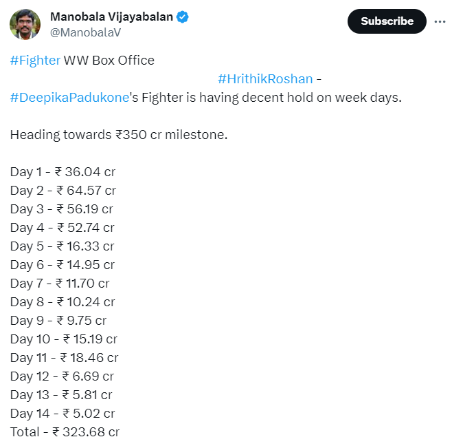 फिल्म क्रिटिक मनोबाला विजय बालन ने अपने आधिकारिक एक्स अकाउंट (Twitter) पर हाल ही में फिल्म की 14 दिनों की कमाई के आंकड़े शेयर किये हैं। 25 जनवरी 2024 को रिलीज हुई 'फाइटर' ने 14 दिनों में वर्ल्ड वाइड 323.68 करोड़ का बिजनेस किया है। इस फिल्म को 400 करोड़ के क्लब में शामिल होने के लिए अब भी कम से कम 80 करोड़ के आसपास का बिजनेस करना है।