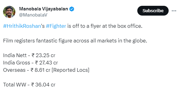 इंडिया में 22 करोड़ से ओपनिंग करने वाली सिद्धार्थ आनंद की फाइटर का पहला दिन का कलेक्शन भी काफी अच्छा हुआ है। फिल्म क्रिटिक मनोबाला विजय बालन ने अपने आधिकारिक ट्विटर अकाउंट पर 'फाइटर' के दुनियाभर में कमाई के आंकड़े शेयर किये हैं। फाइटर ने पहले दिन पर वर्ल्ड वाइड 36.04 करोड़ का बिजनेस किया है।
