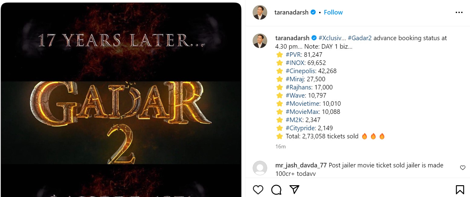 गदर 2 एडवांस बुकिंग में अपने नाम के अनुसार काम कर रही है। फिल्म अब तक 2 लाख से ज्यादा टिकट बेच चुकी है यानी फिल्म पहले दिन ही बॉक्स ऑफिस पर गदर मचाने वाली है। ट्रेड एनालिस्ट तरन आदर्श की रिपोर्ट के अनुसार, गदर 2 ने गुरुवार शाम 4:30 बजे तक कुल 2,73,058 टिकट बेच ली है। इनमें कई नेशनल चेन भी शामिल हैं।