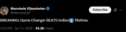 इतना ही नहीं फिल्म ने दुनियाभर में पहले ही दिन कमल हासन की सबसे सफल फिल्मों में से एक फिल्म का रिकॉर्ड भी तोड़ दिया। साउथ के फेमस ट्रेड एनालिस्ट मनोबाला विजयबालन ने अपने आधिकारिक एक्स अकाउंट पर बताया कि गेम चेंजर ने रिलीज के पहले दिन ही इंडियन 2 का रिकॉर्ड तोड़ दिया है, जिसका लाइफटाइम कलेक्शन वर्ल्डवाइड 151 करोड़ का था।