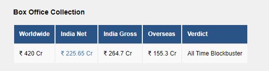 इसके अलावा हिंदी में फिल्म की कमाई 25 लाख, तेलुगु में 3.1 करोड़ और कन्नड़ में 2 लाख तक पहुंची है। सभी बेल्ट की टोटल कमाई मिलाकर इस फिल्म ने अब तक इंडिया में लगभग 225.65 करोड़ का बिजनेस किया है।