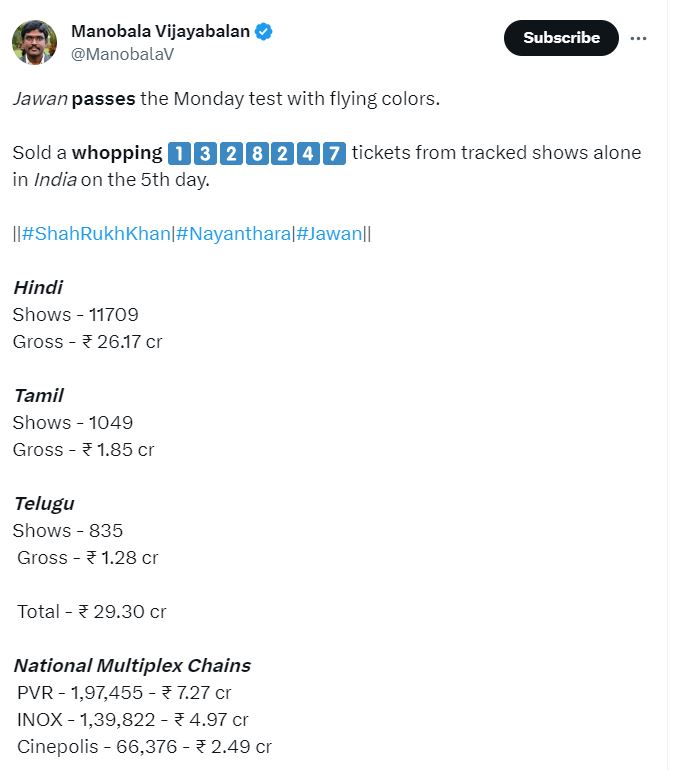 जिसमें 11709 शोज हिंदी में और 1049 के करीब शोज तमिल भाषा में बुक हुए। इसके अलावा पैन इंडिया रिलीज 'जवान' के तेलुगु में करीबन 835 के करीब शोज बुक हुए हैं।