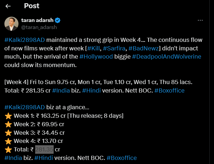 कल्कि 2898 एडी ने हिंदी भाषा में पहले हफ्ते 163.25 करोड़, दूसरे हफ्ते 69.95 करोड़, तीसरे हफ्ते 34.45 करोड़, चौथे हफ्ते टोटल 3.70 करोड़ तक का कलेक्शन किया है। हिंदी में फिल्म का टोटल कलेक्शन 281.35 करोड़ तक पहुंच चुका है और एक महीने बाद भी फिल्म का क्रेज बना हुआ है। मूवी को 300 करोड़ तक पहुंचने के लिए महज 19 करोड़ का कलेक्शन और करना है।