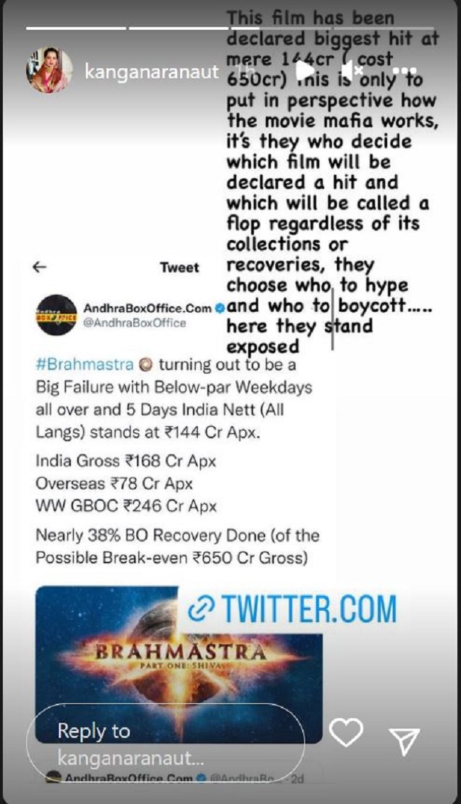 इस पर कंगना रनोट ने ट्वीट करते हुए लिखा है, 'फिल्म को 144 करोड़ रुपये की कमाई पर ही बिगेस्ट हिट डिक्लेयर कर दिया गया है जबकि इसकी कॉस्ट 650 करोड़ रुपये हैl इसी प्रकार मूवी माफिया काम करते हैंl वे तय करते हैं कि कौन सी फिल्म हिट है और कौन सी फिल्म को फ्लॉप करार देना हैl भले ही उसका कलेक्शन और रिकवरी कुछ भी होl वे तय करते हैं किसे हाइप देनी है और किसे बायकॉट करना हैl अब यहां वे एक्सपोज हो गए हैंl'