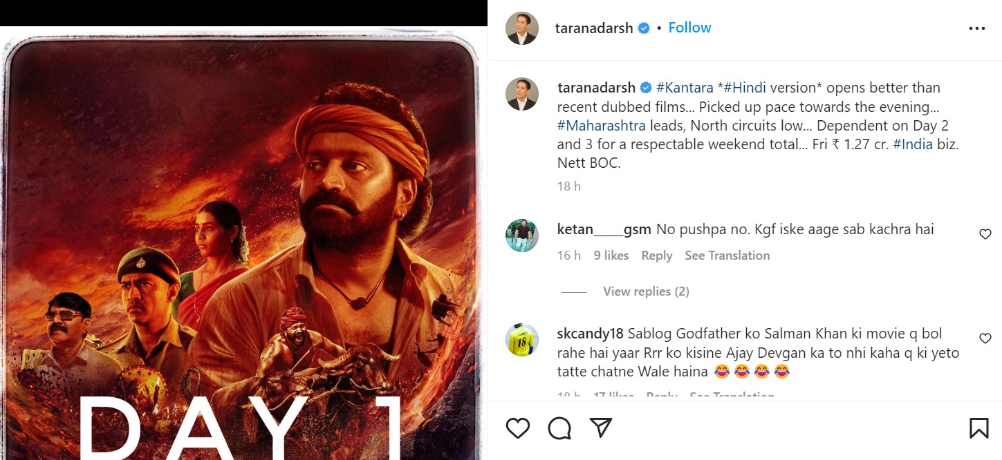 14 अक्टूबर को हिंदी में रिलीज हुई कंटारा ने उम्मीद के मुताबिक बॉक्स ऑफिस पर ठीक शुरुआत की। ट्रेड एनालिस्ट तरन आदर्श के अनुसार, कंटारा ने हिंदी बेल्ट में शुक्रवार को 1.27 करोड़ का बिजनेस किया। ताजा जानकारी के अनुसार कंटारा की कमाई में दूसरे दिन ही 100 प्रतिशत से ज्यादा की बढ़ोत्तरी देखने को मिली। आम तौर पर कोई भी फिल्म रिलीज के दूसरे दिन कमाई के मामले में ज्यादा से ज्यादा 40 से 50 प्रतिशत की बढ़ोत्तरी दिखाती है, लेकिन कंटारा का केस तो एकदम अलग साबित हो रहा है। रिपोर्ट्स के मुताबिक फिल्म ने दूसरे दिन यानी शनिवार को लगभग 2.35 करोड़ का बिजनेस किया है। इसके साथ ही फिल्म के दो दिनों का कलेक्शन लगभग 3.62 करोड़ हो गया है।