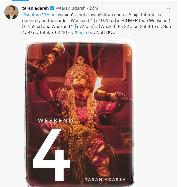 सोमवार को ट्रेड एनालिस्ट तरण आदर्श ने ट्वीट कर बताया कि कांतारा का चौथे वीकेंड का कलेक्शन पहले और दूसरे वीकेंड से भी ज्यादा है। चौथे वीकेंड में फिल्म ने 10.75 करोड़ कमाए। जबकि, पहले वीकेंड में 7.53 करोड़ और दूसरे में 7.25 करोड़ का कलेक्शन किया था।