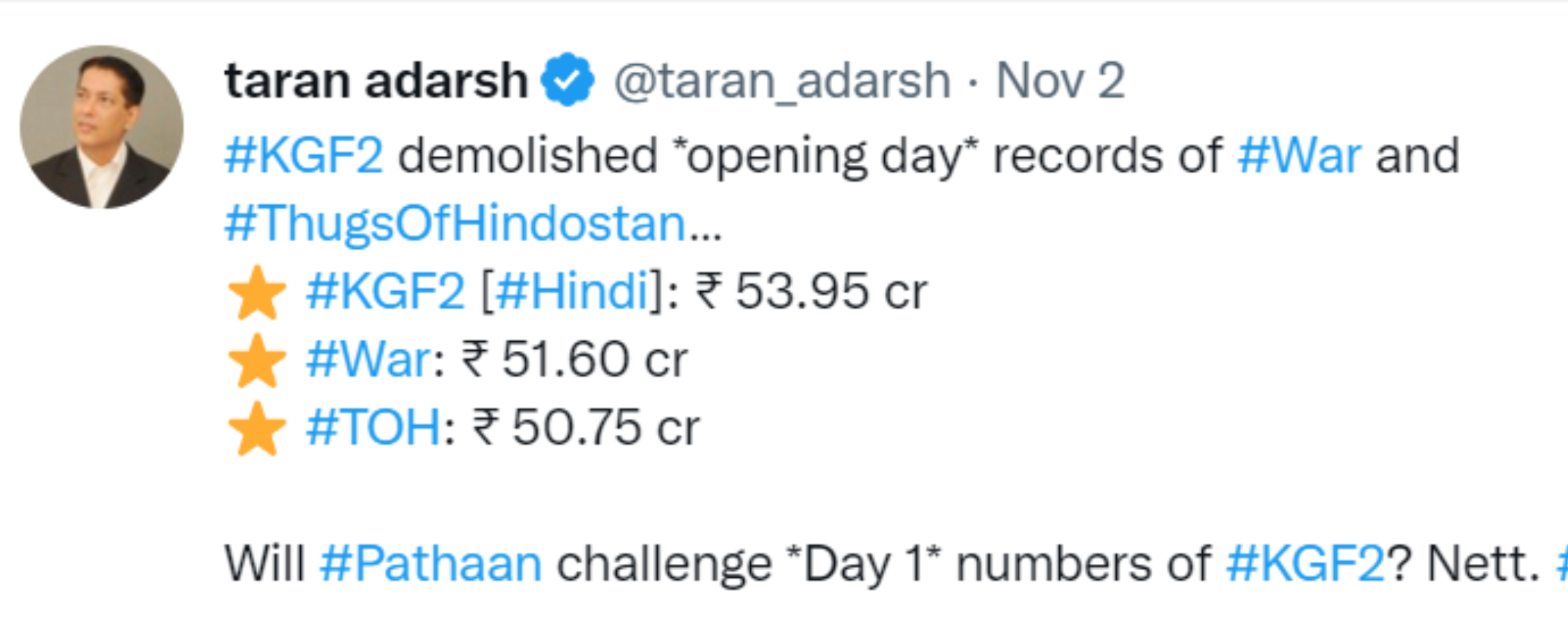 इस साल रिलीज हुई कन्नड़ फिल्म केजीएफ 2 अब कामयाबी का नया पैमाना बन चुकी है। हर बड़ी फिल्म की तुलना इसी फिल्म से की जाती है, जिसके हिंदी वर्जन ने ही 53 करोड़ की झन्नाटेदार ओपनिंग ली थी। यश की फिल्म ने 434 करोड़ का नेट कलेक्शन हिंदी बॉक्स ऑफिस पर किया था। फैन बेस, स्केल और स्टारडम को देखते हुए इतनी ओपनिंग की कल्पना फिलहाल शाह रुख और सलमान की आने वाली फिल्मों से की जा सकती है। इसीलिए, सबकी नजरें पठान पर टिकी हैं।
