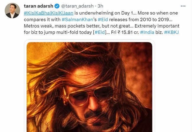 सलमान खान की फिल्म किसी का भाई किसी की जान की विदेशों में पहले दिन की कमाई 11 करोड़ या 1.35 मिलियन डॉलर की कमाई की है। इसमें 15.81 करोड़ रुपये भारत के जोड़ दिए जाएं तो कुल ₹27 करोड़ होते हैं। जहां कलेक्शन के नंबर कम है। लोगों को इस बात का भी ध्यान रखना चाहिए कि शुक्रवार को ईद थी और फैंस उम्मीद जता रहे हैं कि शनिवार और रविवार को फिल्म की कमाई में बढ़ोतरी हो सकती है और यह वीकेंड तक साढ़े 4 मिलियन डॉलर तक पहुंच सकती है।