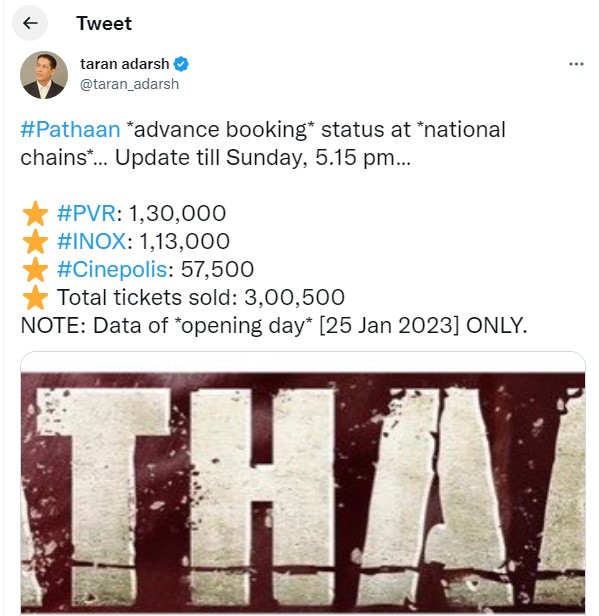 पठान की अब तक 3 लाख 500 से अधिक टिकट बिक चुकी हैं। ये आंकड़े सिर्फ उन्होंने नेशनल लेवल पर बताए हैं, लेकिन वर्ल्डवाइड भी शाह रुख खान की फिल्म का काफी बज है।