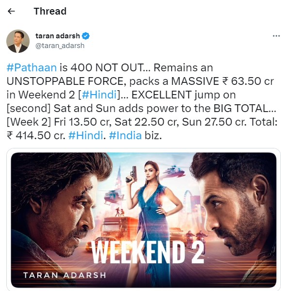 शाह रुख खान की फिल्म की शुरुआत काफी अच्छी हुई थी। इस फिल्म ने इंडियन बॉक्स ऑफिस पर पहले ही दिन में 55 करोड़ के आसपास का बिजनेस किया। ये फिल्म अपना पहला वीकेंड खत्म होने से पहले ही 100 करोड़ का आंकड़ा पार चुकी थी। शाह रुख-दीपिका की फिल्म 'पठान' का दूसरा वीकेंड भी काफी शानदार रहा और दूसरे वीकेंड तक ही ये फिल्म 400 करोड़ के क्लब में शामिल हो गई।