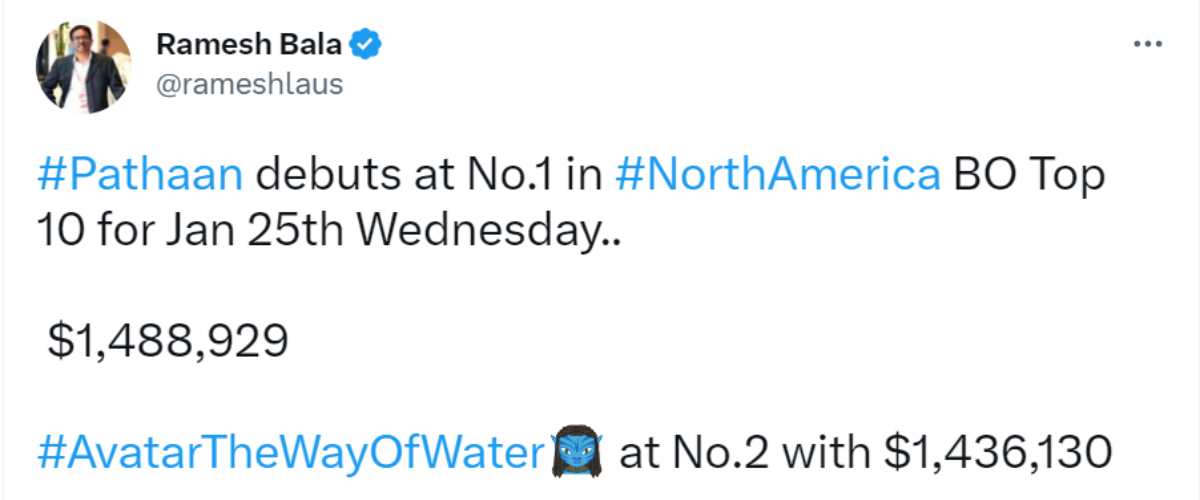 ओवरसीज से आ रही रिपोर्ट्स भी हौसला बढ़ा रही हैं। ट्रेड एक्सपर्ट रमेश बाला के अनुसर, पठान नॉर्थ अमेरिका में नम्बर वन पर चल रही है। फिल्म ने 14 लाख 88 हजार 929 डॉलर का कलेक्शन किया, जबकि अवतार द वे ऑफ वॉटर 14 लाख 36 हजार 130 डॉलर के साथ दूसरे स्थान पर रही। 26 जनवरी की रिपोर्ट्स भी कुछ ऐसी ही हैं। फिल्म लगातार दो दिनों तक नॉर्थ अमेरिका में नम्बर वन पर बनी हुई है।