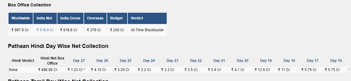 पठान की डोमेस्टिक बॉक्स ऑफिस पर कमाई को देखें तो इस फिल्म ने टोटल नेट 516.9 करोड़ की कमाई की है, जबकि इंडिया में ग्रॉस ये फिल्म 600 करोड़ का आंकड़ा पार कर चुकी है। इंडिया के साथ-साथ ये फिल्म वर्ल्डवाइड भी काफी अच्छी कमाई कर रही है और 1000 करोड़ के क्लब में शामिल होने के लिए इस फिल्म ने अपनी कमर कस ली है।