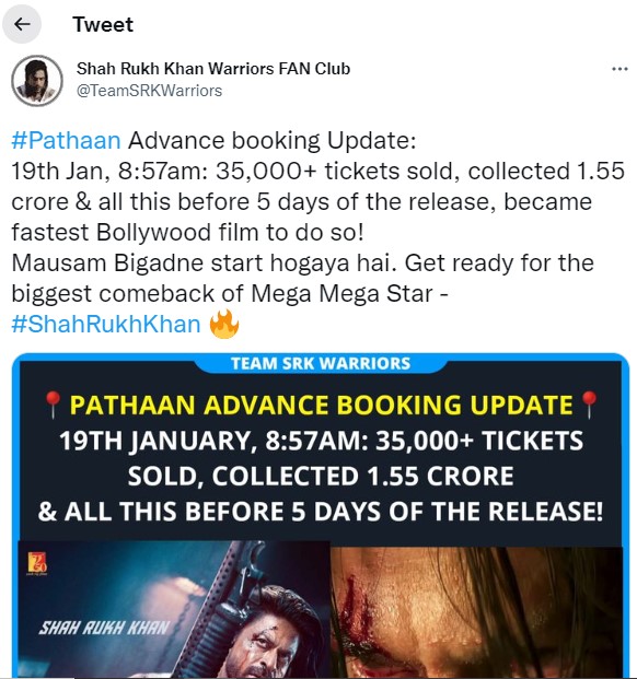 मुझे लगता है कि फिल्म का कलेक्शन 26 जनवरी तक 45 करोड़ तक पहुंच जाएगा'। शाह रुख खान भले ही जगह-जगह जाकर फिल्म का प्रमोशन न कर रहे हों, लेकिन इसके बावजूद सोशल मीडिया पर उनकी फिल्म 'पठान' का पूरा प्रमोशन हो रहा है।