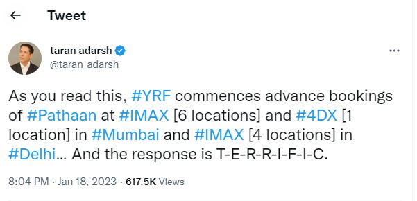 'पठान' की एडवांस बुकिंग भारत में 20 जनवरी से शुरू होनी थी, लेकिन फिल्म टिकट बुकिंग वेबसाइट ने 19 को ही इसकी एडवांस बुकिंग ओपन कर दी है। फैंस में फिल्म को लेकर काफी उत्साह है और कई फैंस ये दावा कर रहे हैं कि फिल्म की 35 हजार से अधिक टिकट सोल्ड हो चुकी हैं और एडवांस बुकिंग में अब तक फिल्म 1 करोड़ की कमाई कर चुकी है।