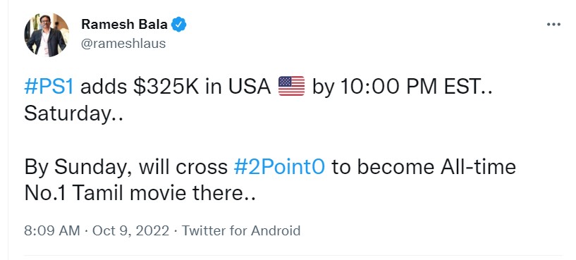 30 सितंबर को रिलीज हुई पीएस-1 ने अपने पहले हफ्ते में ही 325 करोड़ का आंकड़ा पार कर लिया है। फिल्म ने छठवें दिन 318 करोंड़ का बिजनेस किया था और इसके साथ ही पीएस-1 तमिल की छठवीं फिल्म बन गई जिसने वर्ल्डवाइड 300 करोड़ का कलेक्शन किया। इससे पहले तमिल की 2.0, एंथिरन, कबाली, बिगिल और विक्रम जैसी फिल्मों ने वर्ल्डवाइड इतनी कमाई की थी। वहीं सातवें दिन पीएस-1 ने एक बार फिर छलांग लगाई और 325 करोड़ से ज्यादा का कलेक्शन किया। फिल्म अब कमाई के मामले में सिर्फ 2.0 और विक्रम से पीछे रह गई। रविवार यानी 9 अक्टूबर को फिल्म 350 करोड़ का आंकड़ा पर कर इन दोनों फिल्म को भी पछाड़ देगी और वर्ल्डवाइड सबसे ज्यादा कमाई करने वाली तमिल की पहली फिल्म बन जाएगी।