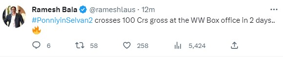 वहीं, फर्स्ट डे पीएस 2 ने वर्ल्डवाइड 64.14 करोड़ का ग्रॉस वर्ल्डवाइड कलेक्शन किया। फिल्म क्रिटिक रमेश बाला के अनुसार, सिर्फ दो दिनों में 'पोन्नियिन सेल्वन 2' वर्ल्डवाइड 100 करोड़ का आंकड़ा पार कर लिया है।