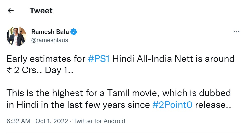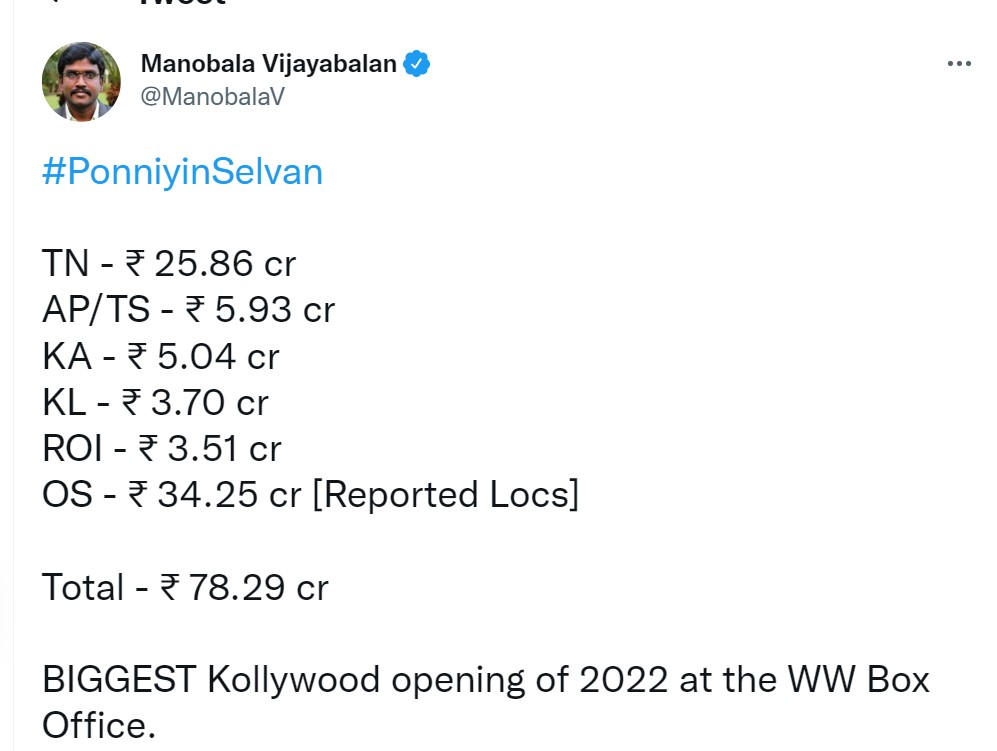 पीएस 1 ने पहले दिन ही कमल हासन की फिल्म विक्रम का रिकॉर्ड तोड़ दिया है। विक्रम के सभी भाषाओं को मिलाकर पहले दिन का कलेक्शन 37.5 करोड़ रुपये था। जबकि, पीएस-1 ने 40 करोड़ के साथ ओपनिंग की है।