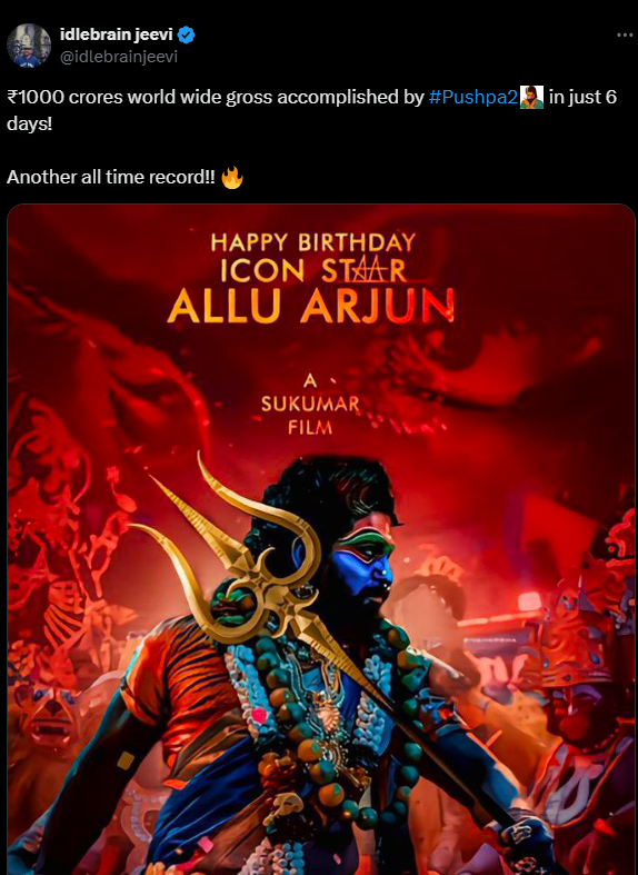 पुष्पा 2 के आधिकारिक एक्स अकाउंट पर इस पेज पर रीट्वीट किया गया है। हालांकि, यह एक अनुमानित आंकड़े हैं। मूवी के फाइनल आंकड़ों में थोड़ा बदलाव देखने को मिल सकता है।