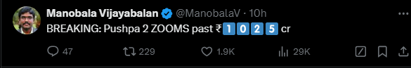 बुधवार को भी पुष्पा 2 का सिक्का दुनियाभर में चला। साउथ के फेमस ट्रेड एनालिस्ट मनोबाला विजयबान ने अपने आधिकारिक एक्स अकाउंट पर फिल्म के दुनियाभर में कमाए गए बुधवार के आंकड़े शेयर किए हैं। मैथ्री मूवी मेकर्स के बैनर तले बनी पुष्पा: द रूल (Pushpa 2 Worldwide Collection) ने एक हफ्ते में टोटल 1025 करोड़ की कमाई कर ली है। पूरी दुनिया में फिल्म ने बुधवार को सिंगल डे पर 25 करोड़ रुपए कमाए हैं।