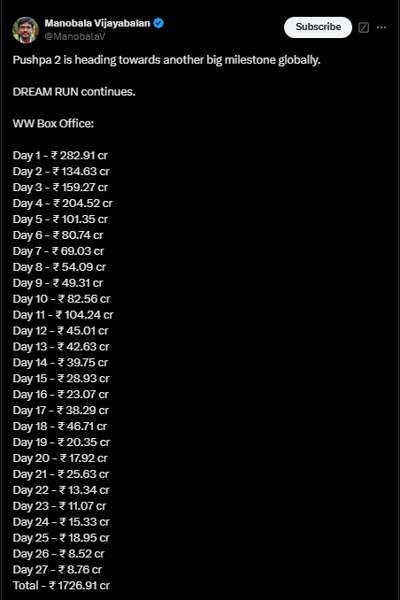 ये फिल्म इंडिया के अलावा जिस देश में सबसे अच्छा परफॉर्म कर रही है वह है नॉर्थ अमेरिका, जहां फिल्म का क्रेज लोगों के सिर चढ़कर बोल रहा है। चलिए अब इस फिल्म ने 27वें दिन कितनी कमाई की है, ये आंकड़े भी बता देते हैं। साउथ ट्रेड एनालिस्ट मनोबाला विजयबालन ने अपने आधिकारिक एक्स अकाउंट पर फिल्म के 27 दिनों के वर्ल्डवाइड कमाई का आंकड़े शेयर कर दिए हैं। इस मूवी ने बुधवार को यानी कि 27वें दिन वर्ल्डवाइड सिंगल डे पर टोटल 8.76 करोड़ की कमाई की है।