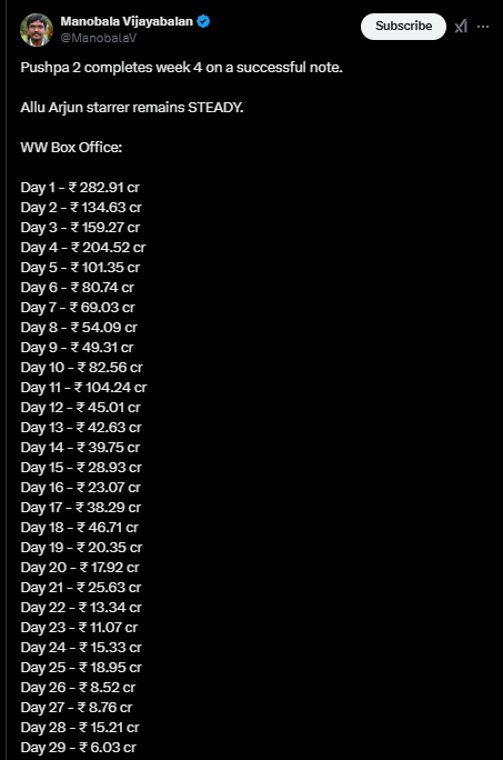 साउथ के फेमस ट्रेड एनालिस्ट मनोबाला विजय बालन ने अल्लू अर्जुन (Allu Arjun) और रश्मिका मंदाना की फिल्म पुष्पा 2 के गुरुवार के वर्ल्डवाइड आंकड़े अपने आधिकारिक एक्स अकाउंट पर शेयर किए। आंकड़ों के मुताबिक, इस फिल्म ने रिलीज के 29वें दिन सिंगल डे पर 6.3 करोड़ के आसपास की कमाई की है।