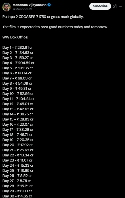 साउथ के फेमस ट्रेड एनालिस्ट मनोबाला विजयबालन ने अपने आधिकारिक एक्स अकाउंट पर फिल्म के 30वें दिन के आंकड़े शेयर कर दिए हैं। एक महीना पूरा होने के साथ ही शुक्रवार को अल्लू अर्जुन की फिल्म पुष्पा 2 ने दुनियाभर में सिंगल डे पर 4.65 करोड़ का कलेक्शन किया है।