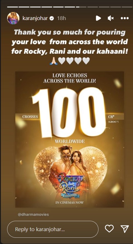 28 जुलाई को रिलीज हुई इस फिल्म ने वर्ल्डवाइड 100 करोड़ से ज्यादा की कमाई कर ली है। फिल्म के 100 करोड़ के क्लब में शामिल होने पर करण ने खुशी जताई है। उन्होंने सोशल मीडिया पर लिखा, "रॉकी, रानी और हमारी कहानी के लिए दुनिया भर से अपना प्यार देने के लिए आपका बहुत-बहुत धन्यवाद।"