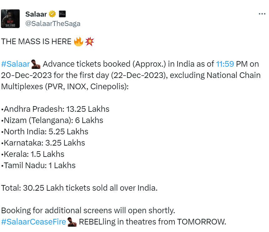 सालार के मेकर्स ने सोशल मीडिया हैंडल एक्स पर ट्वीट कर इस बात की जानकारी दी कि इस मूवी के आंध्र प्रदेश में 13.25 लाख, निजाम (तेलंगाना) में 6 लाख, उत्तर भारत में 5.25 लाख, कर्नाटक में 3.25 लाख, केरल में 1.5 लाख और तमिलनाडु में 1 लाख टिकट बिके।