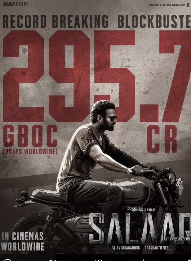 'सालार' टिकट विंडो पर पॉजिटिव रिव्यू के साथ ओपन हुई है। फिल्म में प्रभास के अलावा श्रुति हासन और पृथ्वीराज सुकुमारन भी लीड रोल में हैं। पहले दिन मूवी ने 178 करोड़ का वर्ल्डवाइड कलेक्शन किया। वहीं, दूसरे दिन इसने 200 क्या 250 करोड़ तक का आंकड़ा पार कर दिया। 'सालार' फिल्म ने सेकंड डे 295.7 करोड़ का ग्रॉस ग्लोबल कलेक्शन किया है।