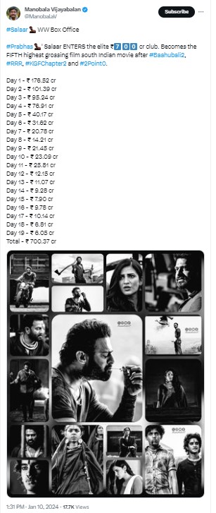 फिल्म क्रिटिक मनोबाला विजयबालन ने अपने आधिकारिक ट्विटर अकाउंट पर सालार के वर्ल्डवाइड आंकड़े शेयर किये हैं। जिसके अनुसार रिलीज के 19वें दिन सालार ने दुनियाभर में 6.05 करोड़ का बिजनेस किया है और प्रशांत नील के निर्देशन में बनी इस फिल्म की दुनियाभर में टोटल कमाई अब तक 700.37 करोड़ तक पहुंच चुकी है।
