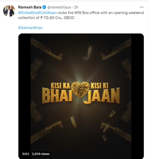 सलमान खान की फिल्म अजय देवगन की 'भोला' और सामंथा रुथ प्रभु की 'शाकुंतलम' को कड़ी टक्कर देती नजर आ रही है। फिल्म क्रिटिक रमेश बाला के ट्वीट कर जानकारी दी कि 'किसी का भाई किसी की जान' ने वर्ल्डवाइड 112.80 करोड़ का वर्ल्डवाइड ग्रॉस बिजनेस किया है।