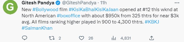 उधर, हॉलीवुड ट्रेड एनालिस्ट गीतेश पांड्या ने ट्वीट कर जानकारी दी कि 'किसी का भाई किसी की जान' ने नॉर्थ अमेरिकन बॉक्स ऑफिस पर 325 थिएटर्स से कुल 950 डॉलर की कमाई की है।
