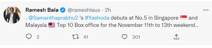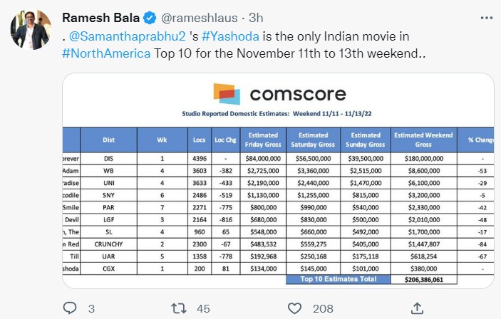 उन्होंने ट्वीट किया, '@Samantharuthprabhu2 की #Yashoda एक मात्र ऐसी भारतीय मूवी है जो नॉर्थ अमेरिका में 11 से 13 नवंबर तक टॉप 10 में बनी हुई है।'