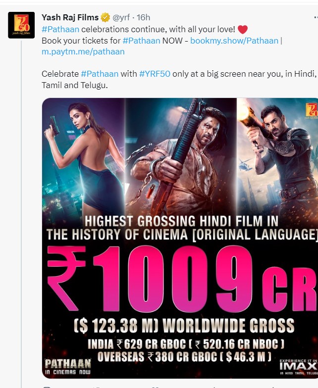 वाईआरएफ (यश राज प्रोडक्शन्स) ने ट्वीट कर जानकारी दी कि पठान फिल्म हिंदी सिनेमा की हाईएस्ट ग्रॉसिंग फिल्म बन गई है। फिल्म का इंडिया में ग्रॉस बॉक्स ऑफिस कलेक्शन 629 करोड़ है, जिसमें से नेट कलेक्शन 520.16 करोड़ है। ओवरसीज फिल्म का कलेक्शन 380 करोड़ है।