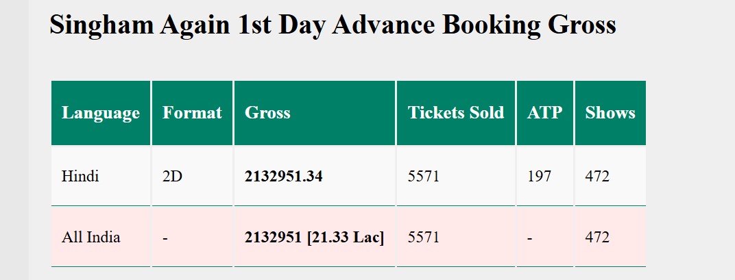 सैकनिल्क की रिपोर्ट में 'सिंघम अगेन' फिल्म के पहले दिन के एडवांस बुकिंग आंकड़े सामने आ चुके हैं। इस खबर को लिखे जाने तक सिंघम अगेन ने 21 लाख तक की कमाई कर डाली है। फिल्म की 5571 टिकटें बिक चुकी हैं।