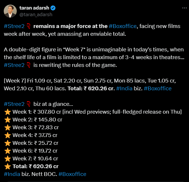 स्त्री 2 को सिनेमाघरों में रिलीज हुए पूरे-पूरे सात हफ्ते हो चुके हैं। मूवी ने पहले वीक में 307.80 करोड़, दूसरे वीक में 145.80 करोड़, तीसरे वीक में 72.83 करोड़, चौथे हफ्ते में 37.75, पांचवें हफ्ते में 25.72, छठे हफ्ते में 19.72 और सातवें हफ्ते में टोटल 10.64 करोड़ का कलेक्शन किया है।