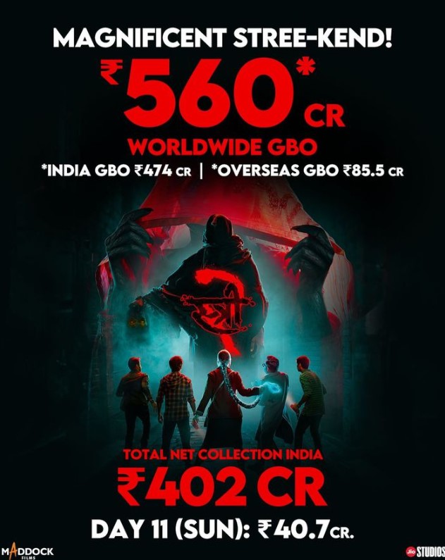 मात्र 11 दिनों में 560 करोड़ के आंकड़े को टच करना किसी भी फिल्म के लिए बड़ी बात है। हालांकि, यह वर्ल्डवाइड कलेक्शन है। वहीं, इस पड़ाव को पार करने के बाद यह देखना दिलचस्प होगा कि क्या 'स्त्री 2' 1000 करोड़ कमाने वाली फिल्मों को पीछे छोड़ पाएगी।