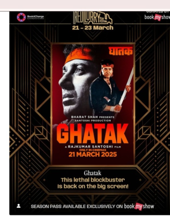 दरअसल उनकी ब्लॉकबस्टर फिल्म घातक को रेड लॉरी फिल्म फेस्टिवल के दौरान सिनेमाघरों में दोबारा से रिलीज किया जाएगा। 21 मार्च को घातक बड़े पर्दे पर दस्तक देगी। बुक माय शो ऐप पर इसकी एडवांस बुकिंग के लिए सीजन पास विडों भी ओपन हो गई हैं। बता दें कि निर्देशक राजकुमार संतोषी के निर्देशन में बनी घातक सनी देओल के एक्टिंग करियर की कल्ट मूवी है, इस फिल्म का क्रेज आज भी फैंस में देखने को मिल जाता है।