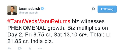 व्यापार विश्लेषक तरण आदर्श ने ट्विटर पर फिल्म के कलेक्शन की जानकारी दी। उन्होंने ट्वीट किया, 'तनु वेड्स मनु रिटर्न्स के बिजनेस में अद्भुत बढ़ोतरी हुई। दूसरे दिन बिजनेस कई गुना बढ़ा। शुक्रवार को 8.75 करोड़, शनिवार को 13.10 करोड़ से ज्यादा। कुल 21.85 करोड़ का भारत में बिजनेस।'