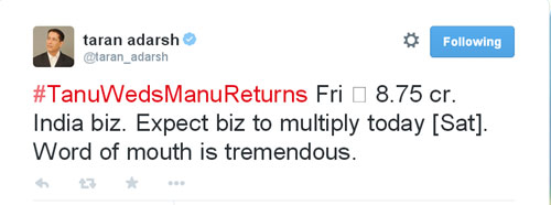 फिल्म व्यापार विश्लेषक तरण आदर्श ने ट्विटर पर फिल्म के कलेक्शन की जानकारी दी। उन्होंने ट्वीट किया, 'तनु वेड्स मनु रिटर्न्स ने शुक्रवार को भारत में 8.75 करोड़ का बिजनेस किया। आज (शनिवार) कलेक्शन कई गुना बढ़ सकता है। जबरदस्त तारीफ हो रही है।'