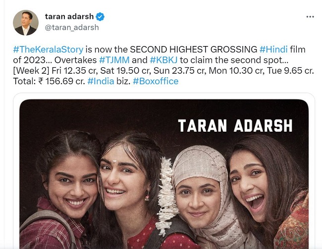 ट्विटर पर बुधवार को इस बारे में जानकारी देते हुए ट्रेड एनालिस्ट तरण आदर्श ने लिखा, "2023 में सबसे ज्यादा कमाई करने वाली हिंदी फिल्मों की सूची में दूसरे नंबर पर द केरल स्टोरी आ गई है। इसने तू झूठी मैं मक्कार और किसी का भाई किसी की जान को हटाकर यह स्थान प्राप्त किया है। फिल्म की कुल कमाई 156.59 करोड़ रुपये की हुई है।" इसे लेकर फैंस भी काफी उत्साहित है।