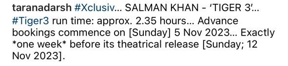इस पोस्ट के जरिए तरण ने बताया है- ''सलमान खान, कटरीना कैफ और इमरान हाशमी स्टारर टाइगर 3 की टिकटों की एडवांस बुकिंग की शुरुआत रिलीज से एक सप्ताह पहले यानी 5 नवंबर से शुरू हो जाएगी। जब इस मूवी की टोटल लेंथ 2 घंटे 35 रहने वाली है।'' इस तरह से तरण ने फिल्म 'टाइगर 3' को लेकर अहम जानकारी साझा की है।