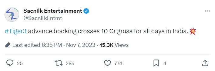 टाइगर 3 को लेकर लोगों का क्रेज फिल्म की एडवांस बुकिंग में साफ दिखाई दे रहा है। फिल्म ने तीन दिनों में लगभग 10 करोड़ की टिकट बेच ली। ट्रेड पोर्टल Sacnilk ने एक्स पर टाइगर 3 की एडवांस बुकिंग की रिपोर्ट शेयर की है। अपडेट के अनुसार, देशभर में टाइगर 3 ने लगभग 10 करोड़ का ग्रॉस कलेक्शन कर लिया है।