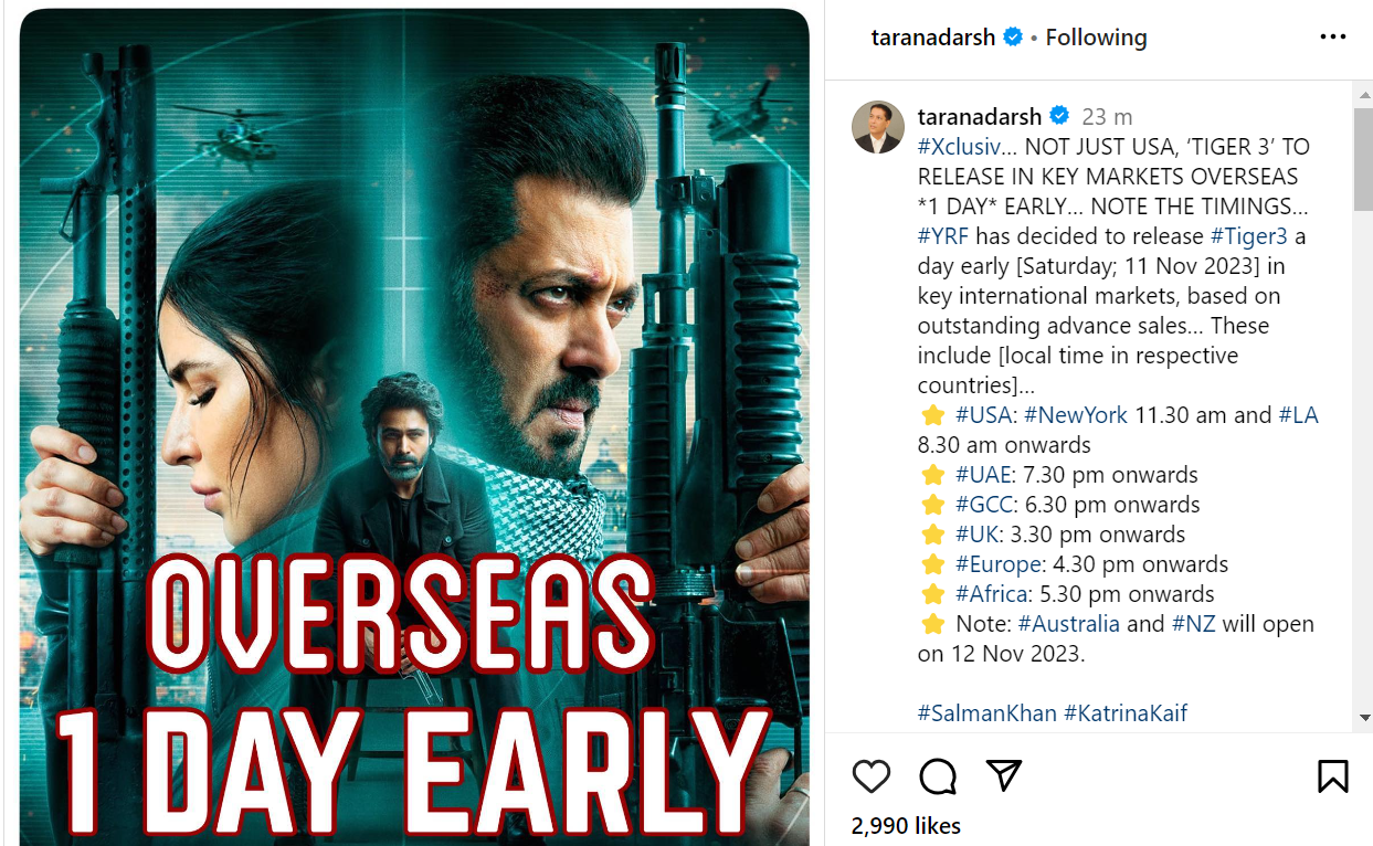 इसके अलावा इस पोस्ट में 'टाइगर 3' की ओवरसीज मार्केट में शो की टाइमिंग की जानकारी भी दी गई है, जिसके आधार पर विदेशों में सलमान खान की फिल्म के शो की टाइमिंग इस प्रकार है-